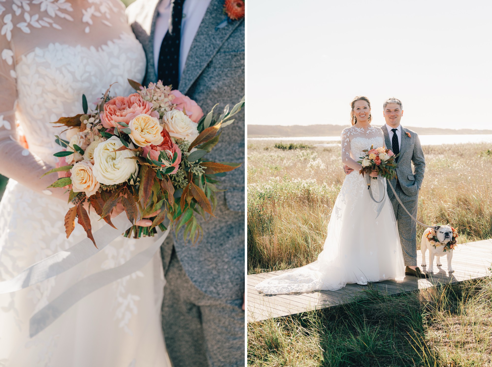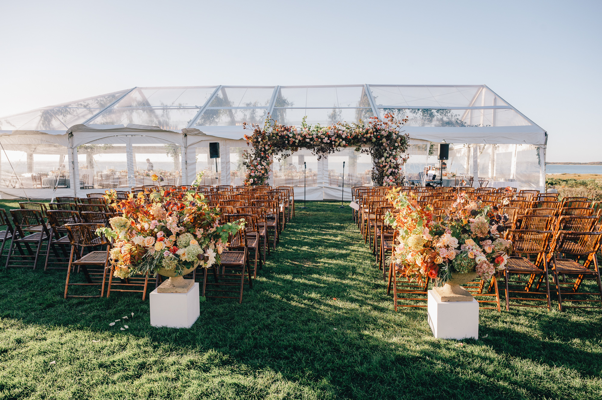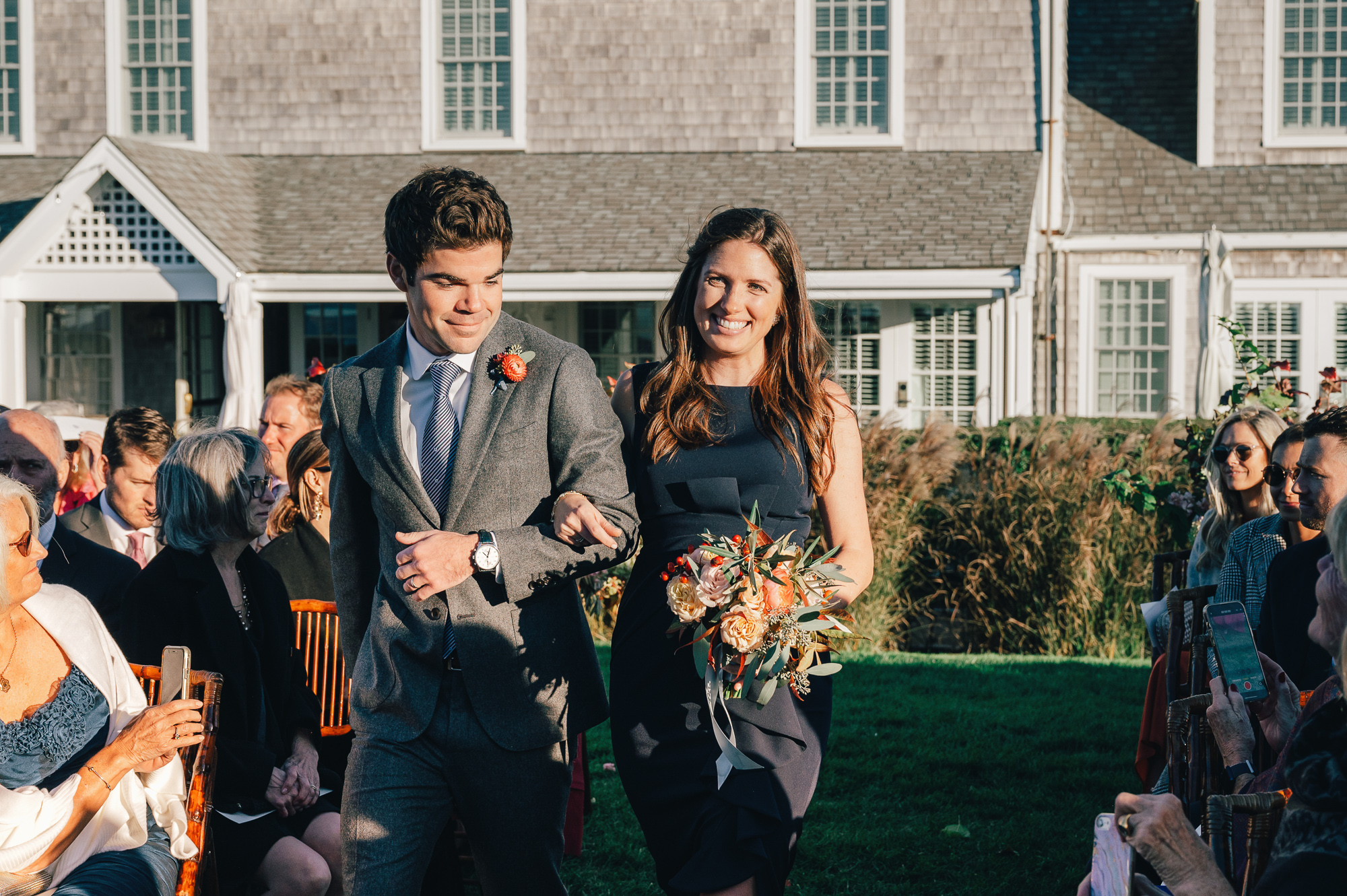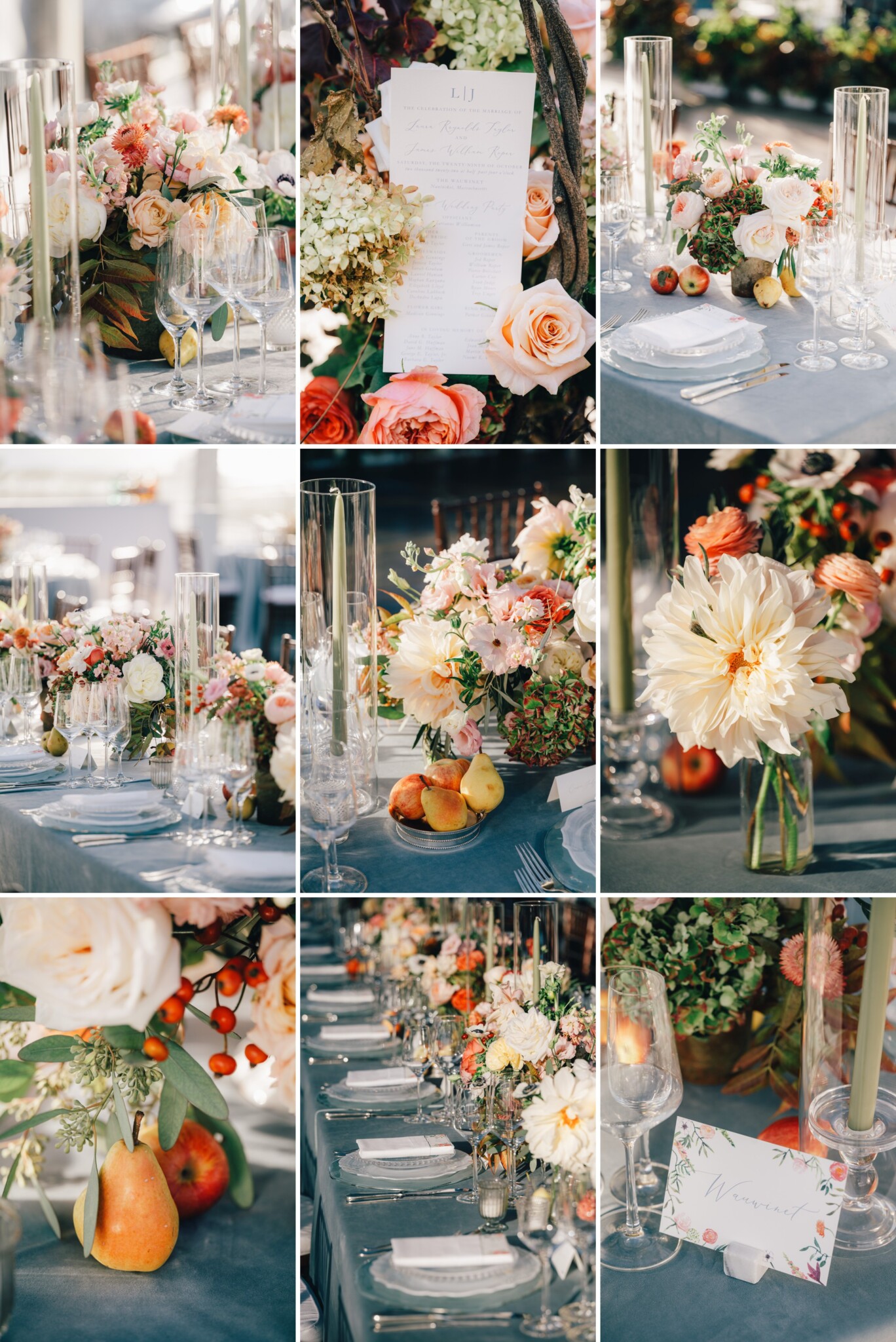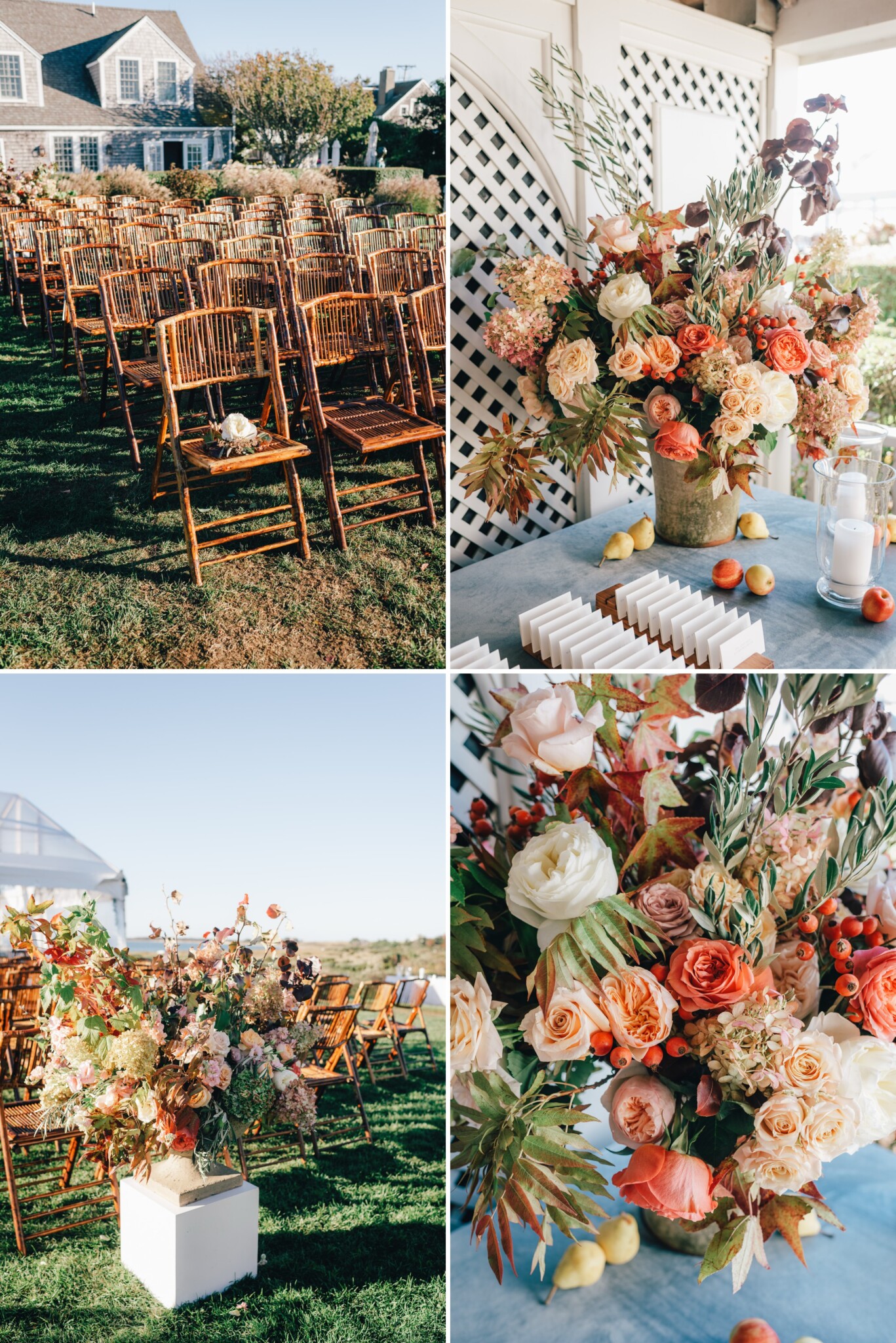 Laura & James were married on the lawn of the Wauwinet, with their vows officiated by author, Marianne Williamson. The perfect fall day on the harbor was GORGEOUSLY accented with the most vibrant autumn colors in the flowers adorning everything from the ceremony arch, the escort card table, the floral and fruit centerpieces, the cake and more. I especially loved how the couple coordinated these colors to enhance James’s grey suit and the bridesmaids’ mix-match blue dresses. A feast for the eyes!