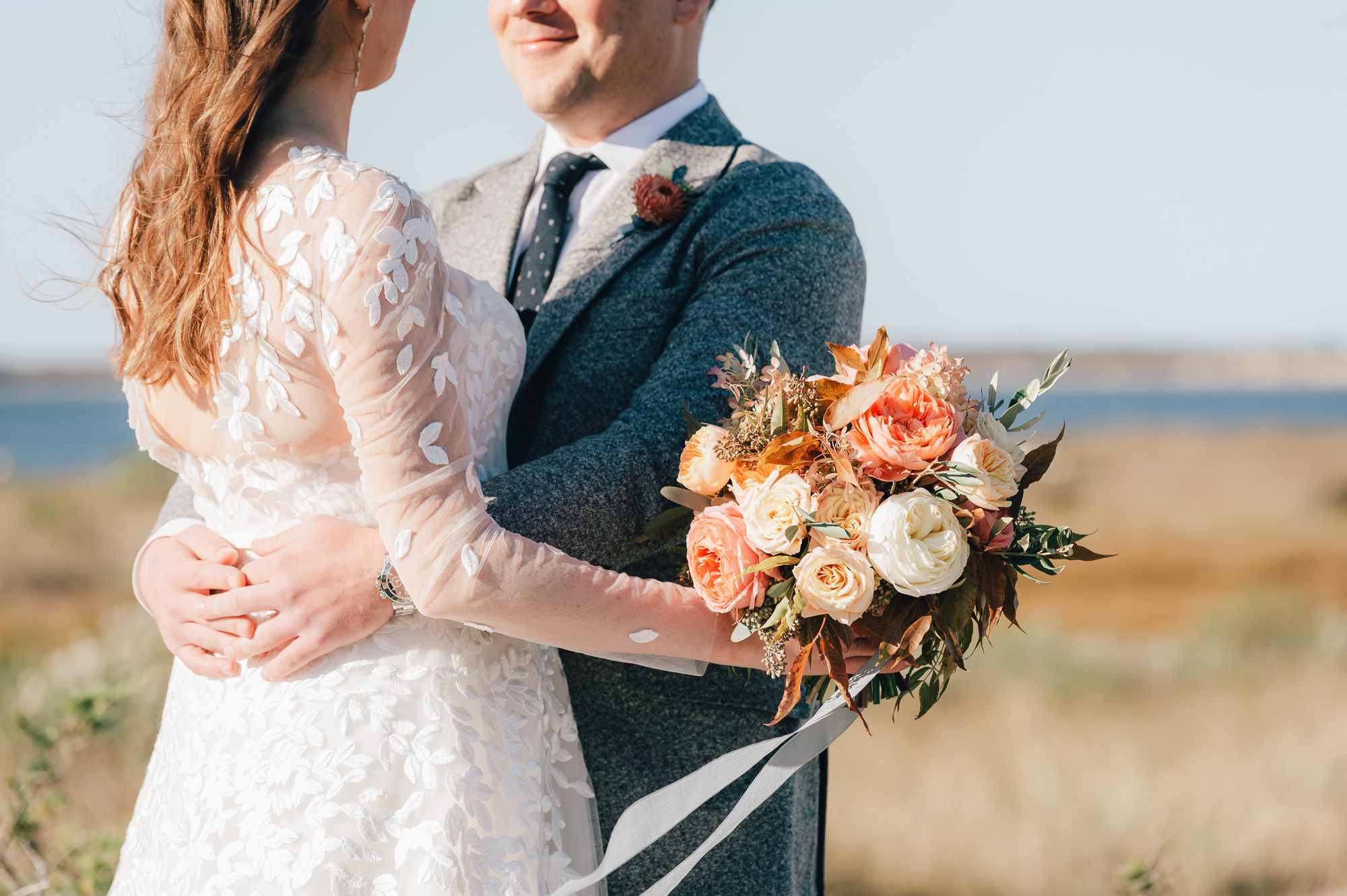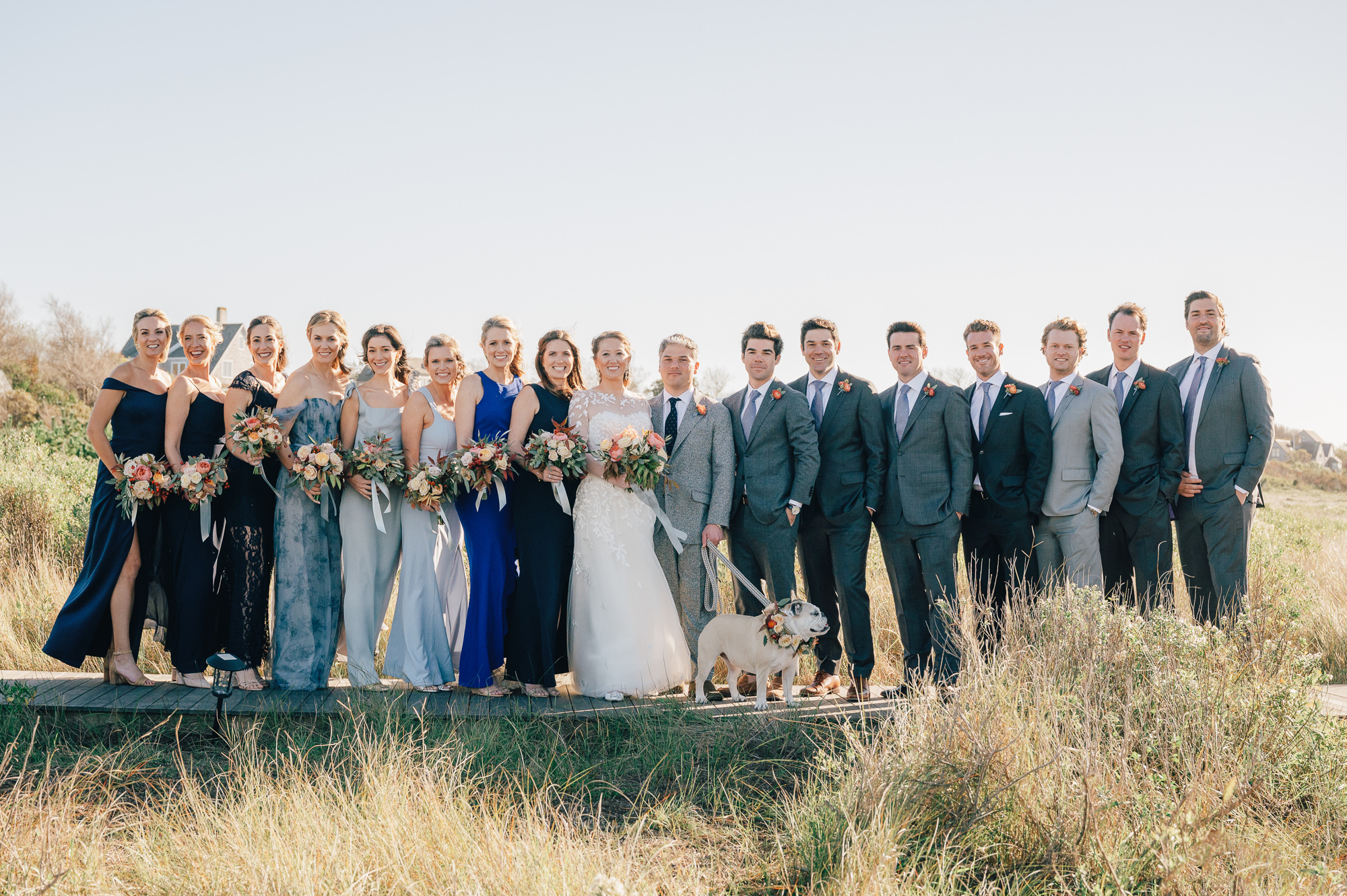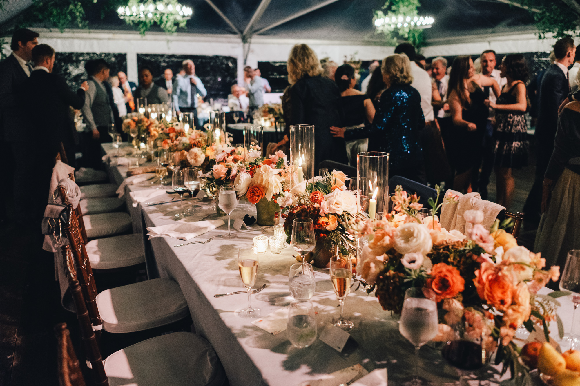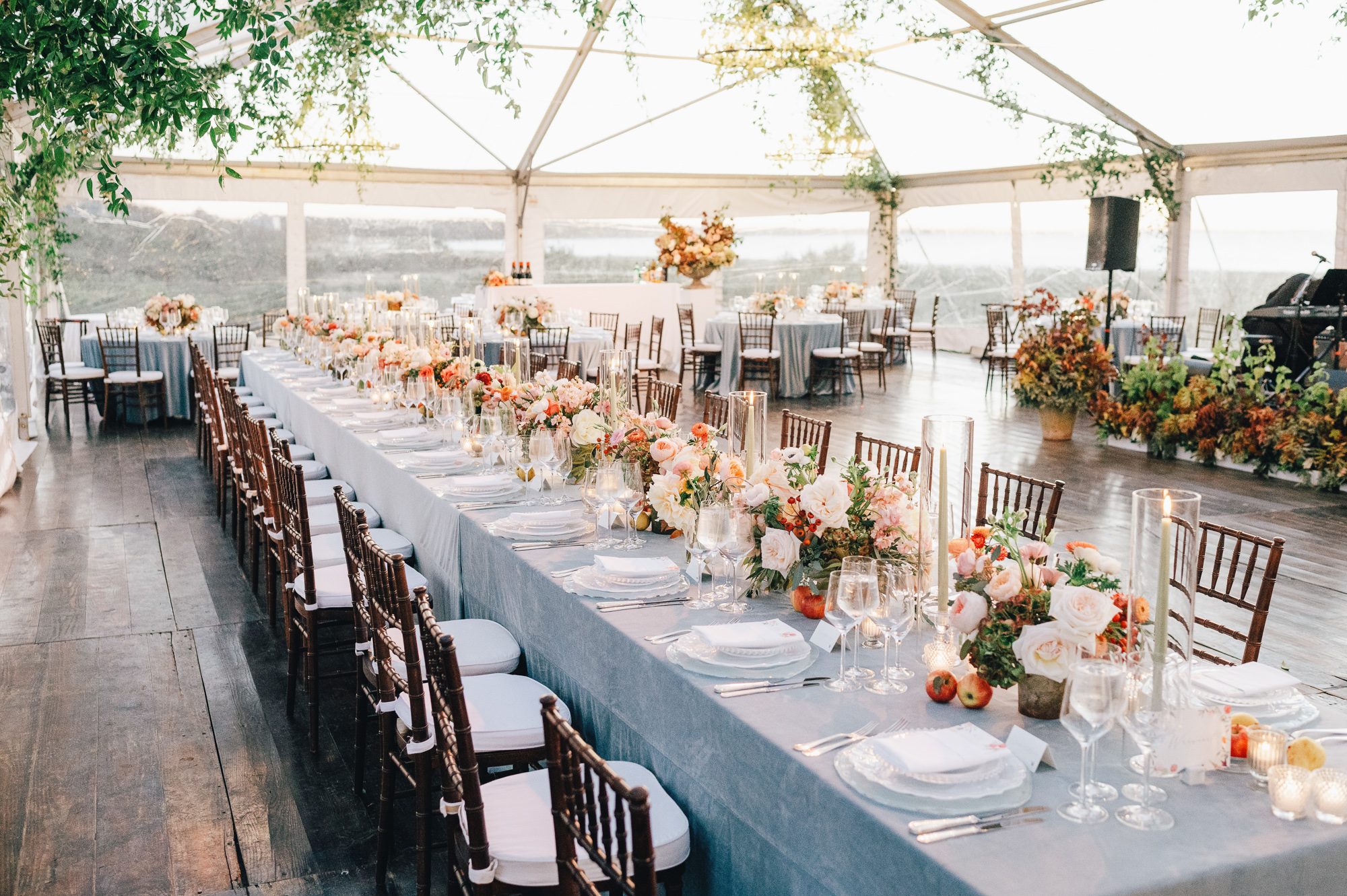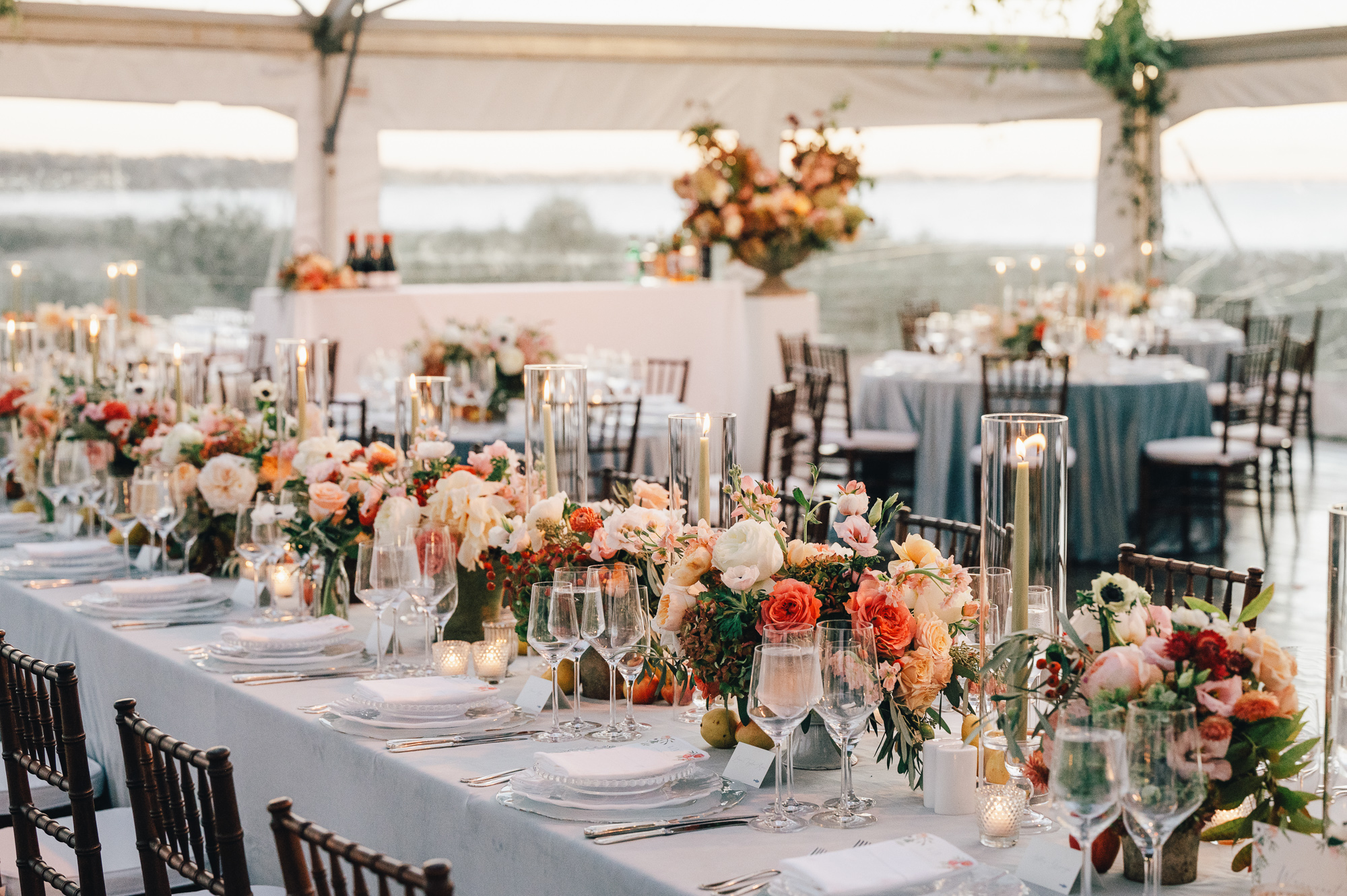 Laura & James were married on the lawn of the Wauwinet, with their vows officiated by author, Marianne Williamson. The perfect fall day on the harbor was GORGEOUSLY accented with the most vibrant autumn colors in the flowers adorning everything from the ceremony arch, the escort card table, the floral and fruit centerpieces, the cake and more. I especially loved how the couple coordinated these colors to enhance James’s grey suit and the bridesmaids’ mix-match blue dresses. A feast for the eyes!