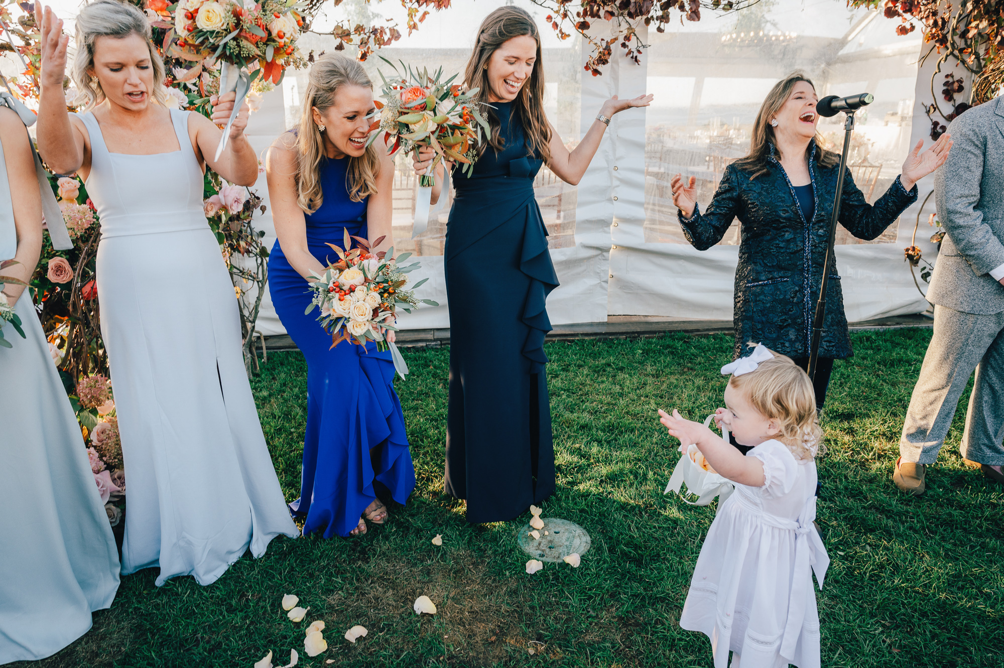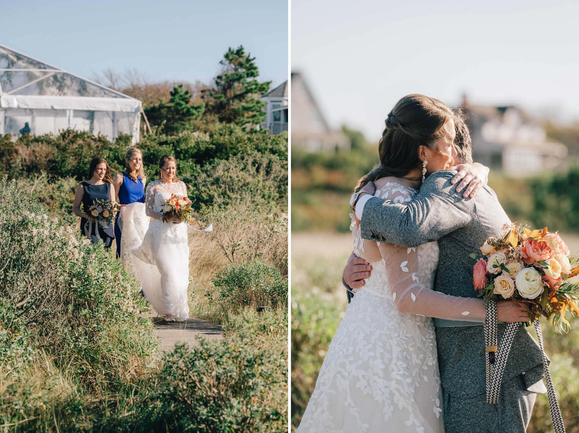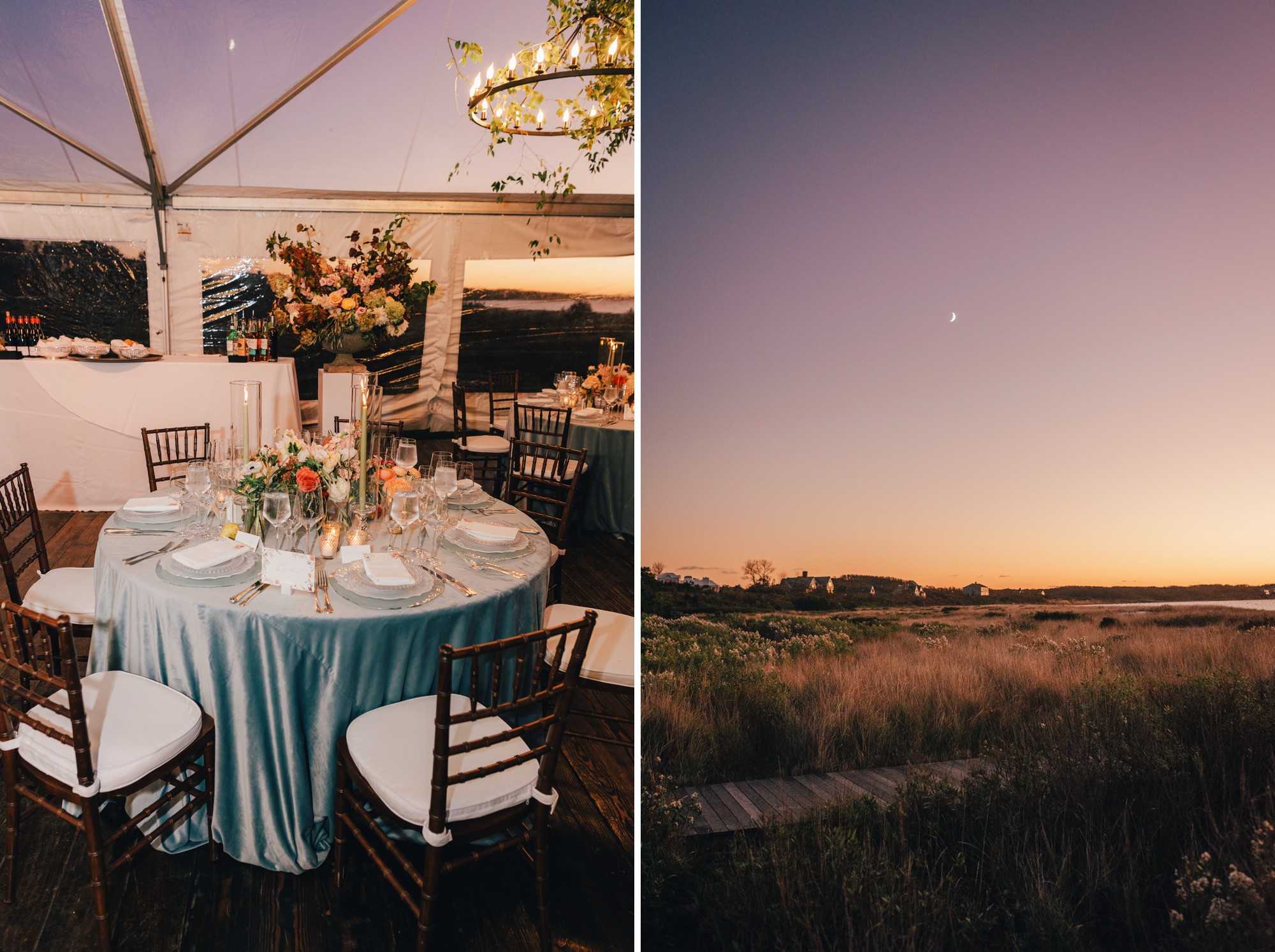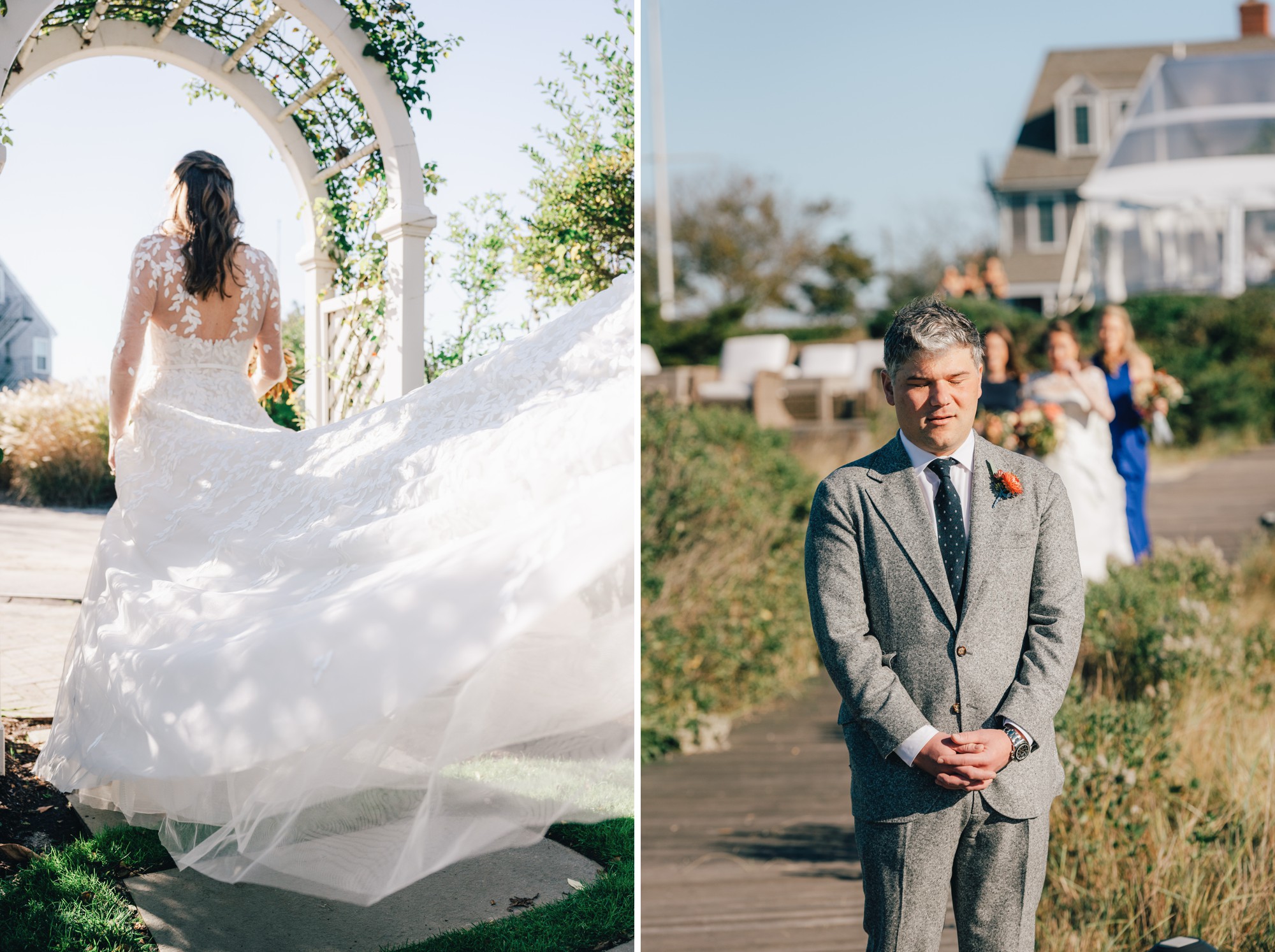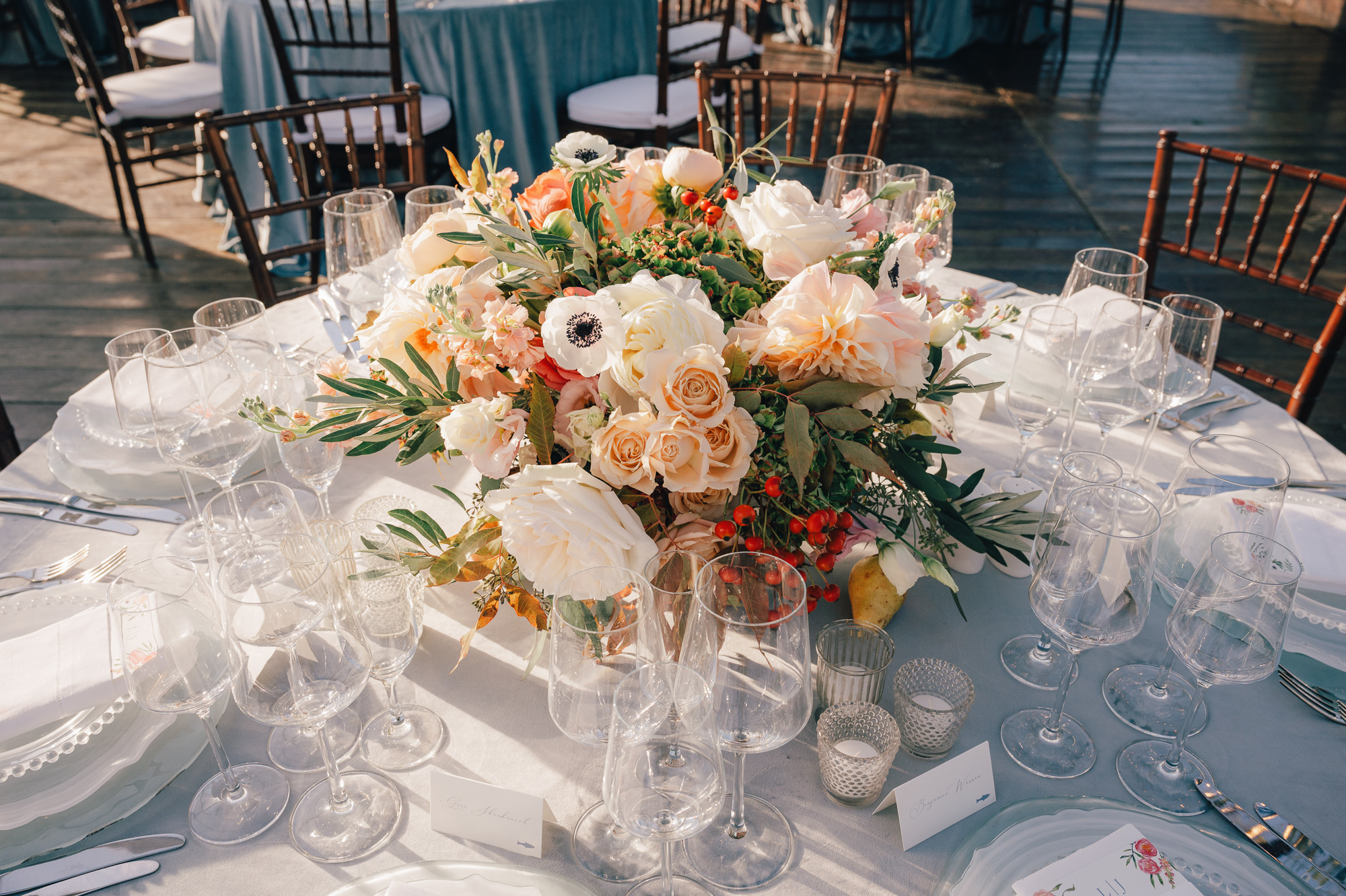 Laura & James were married on the lawn of the Wauwinet, with their vows officiated by author, Marianne Williamson. The perfect fall day on the harbor was GORGEOUSLY accented with the most vibrant autumn colors in the flowers adorning everything from the ceremony arch, the escort card table, the floral and fruit centerpieces, the cake and more. I especially loved how the couple coordinated these colors to enhance James’s grey suit and the bridesmaids’ mix-match blue dresses. A feast for the eyes!