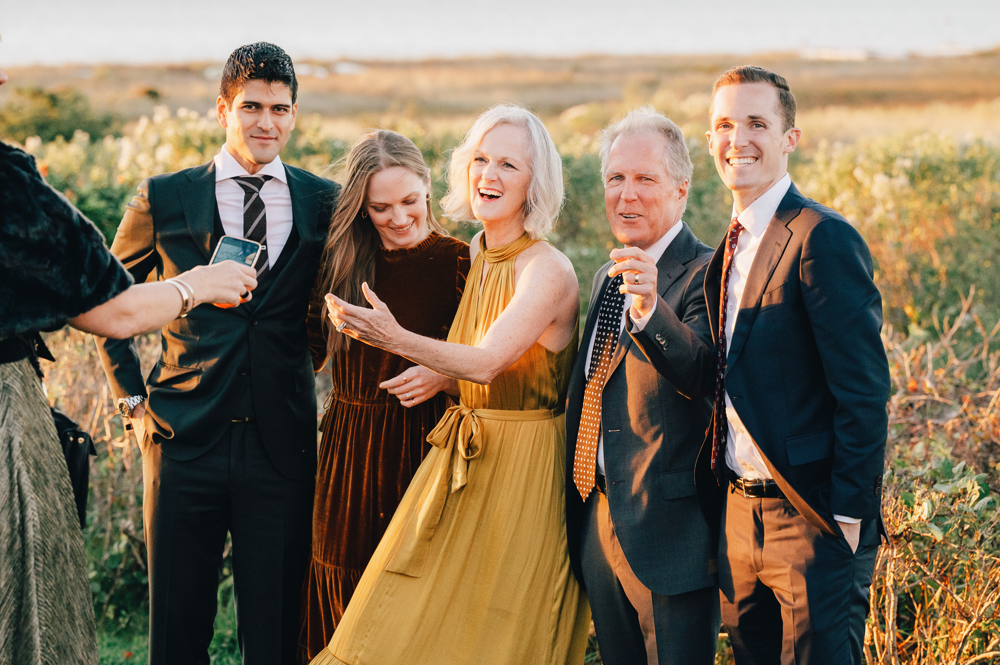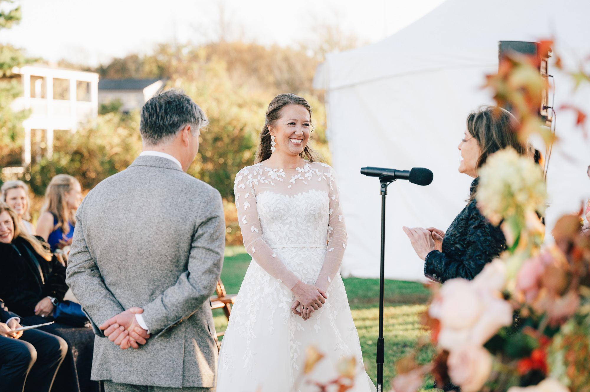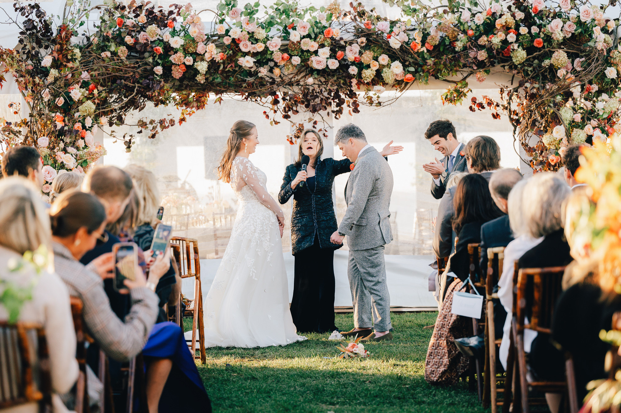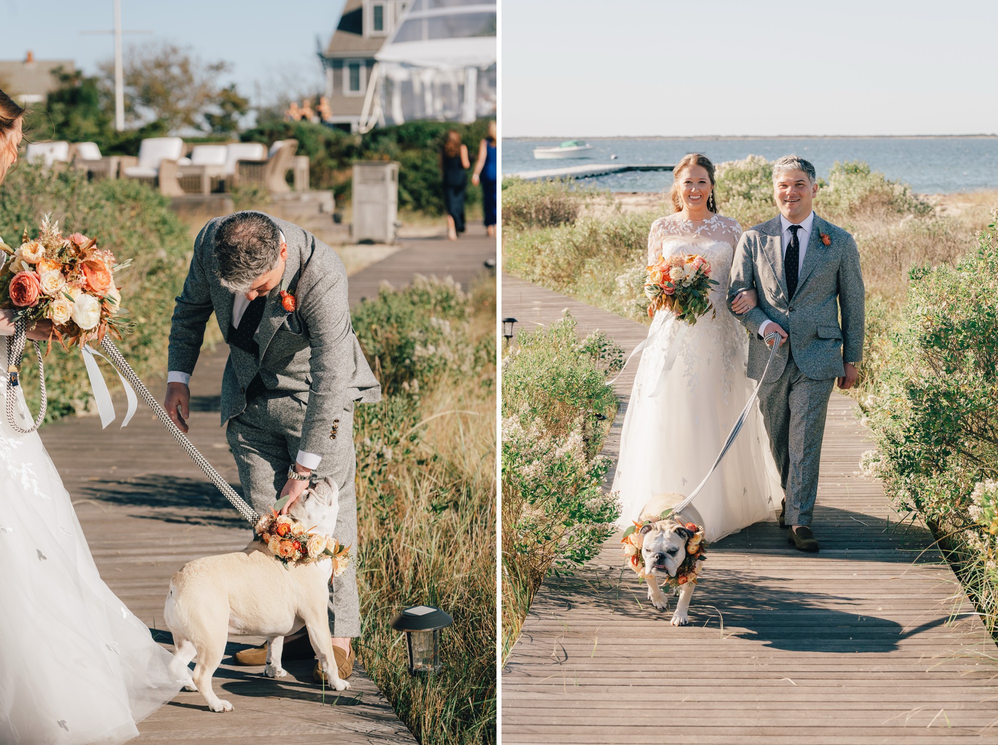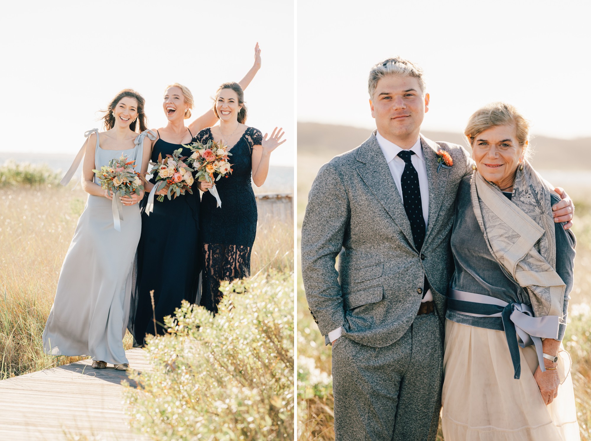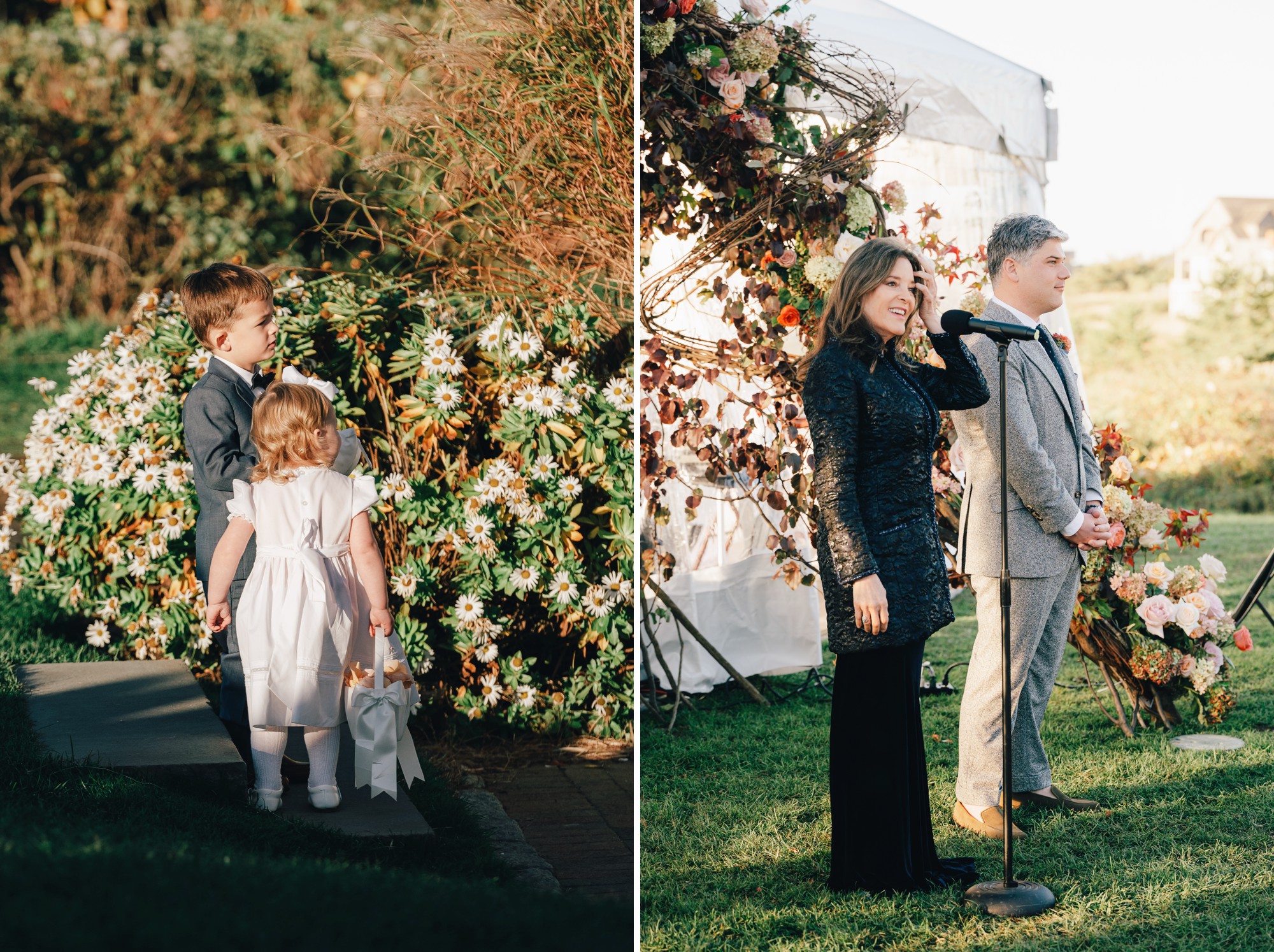 Laura & James were married on the lawn of the Wauwinet, with their vows officiated by author, Marianne Williamson. The perfect fall day on the harbor was GORGEOUSLY accented with the most vibrant autumn colors in the flowers adorning everything from the ceremony arch, the escort card table, the floral and fruit centerpieces, the cake and more. I especially loved how the couple coordinated these colors to enhance James’s grey suit and the bridesmaids’ mix-match blue dresses. A feast for the eyes!