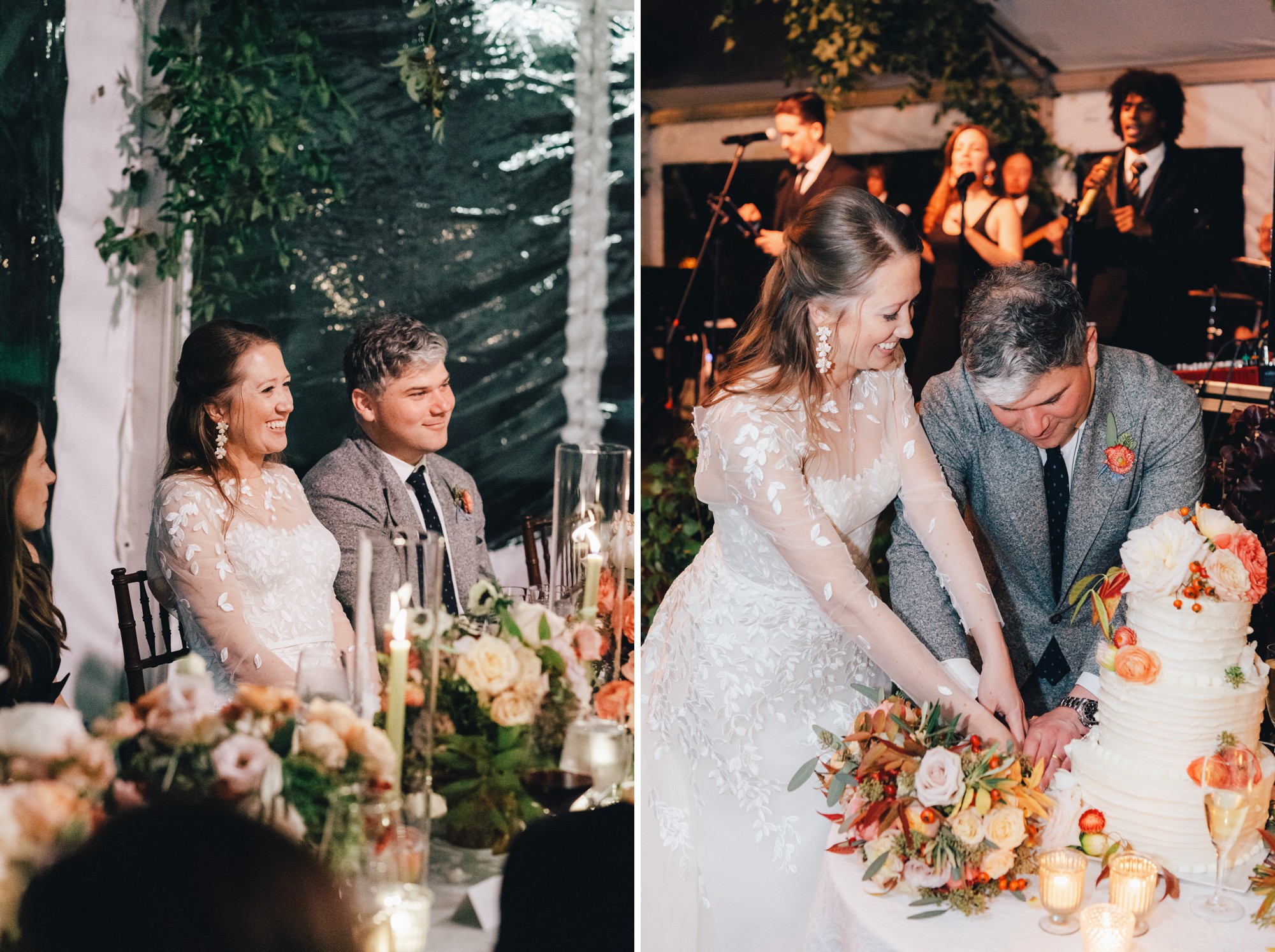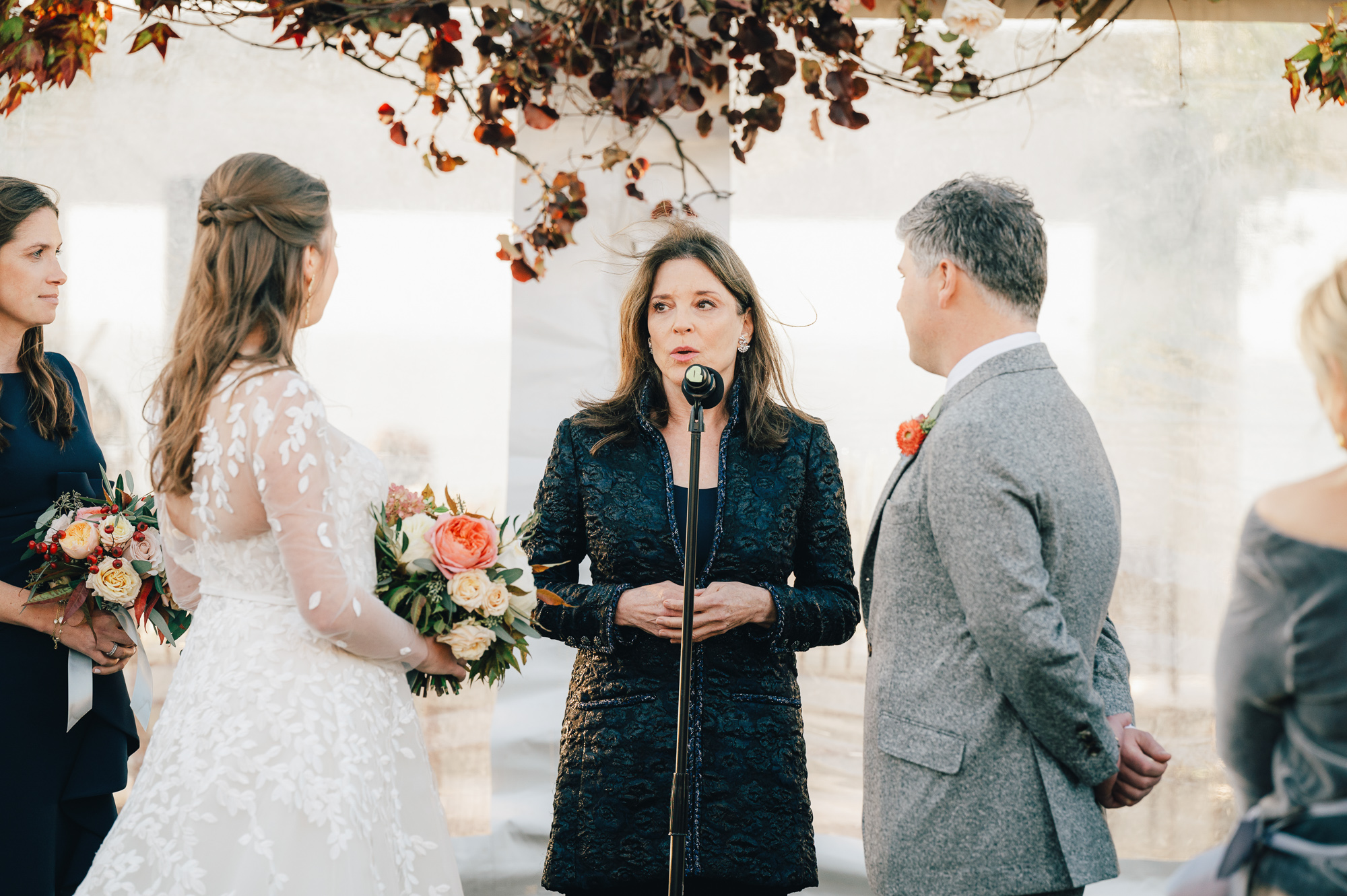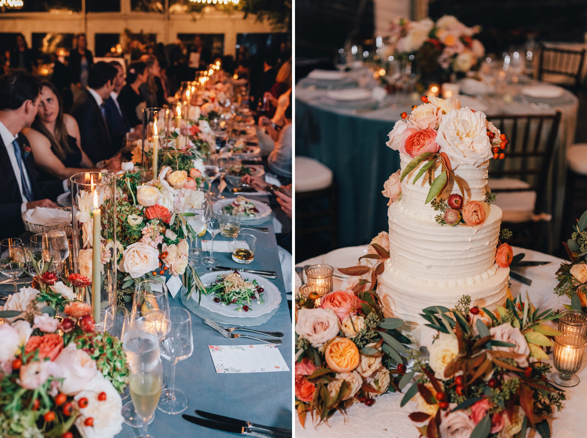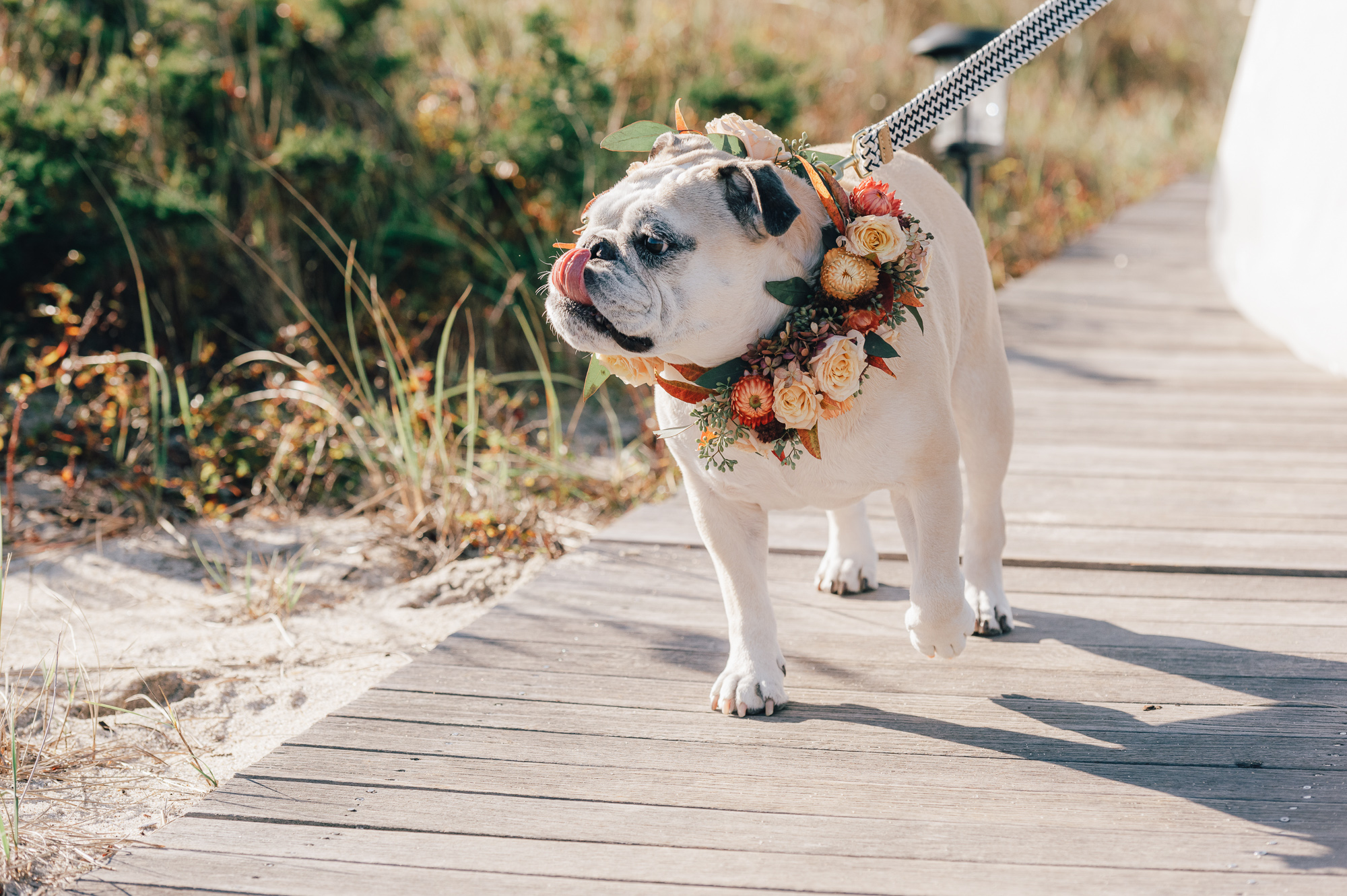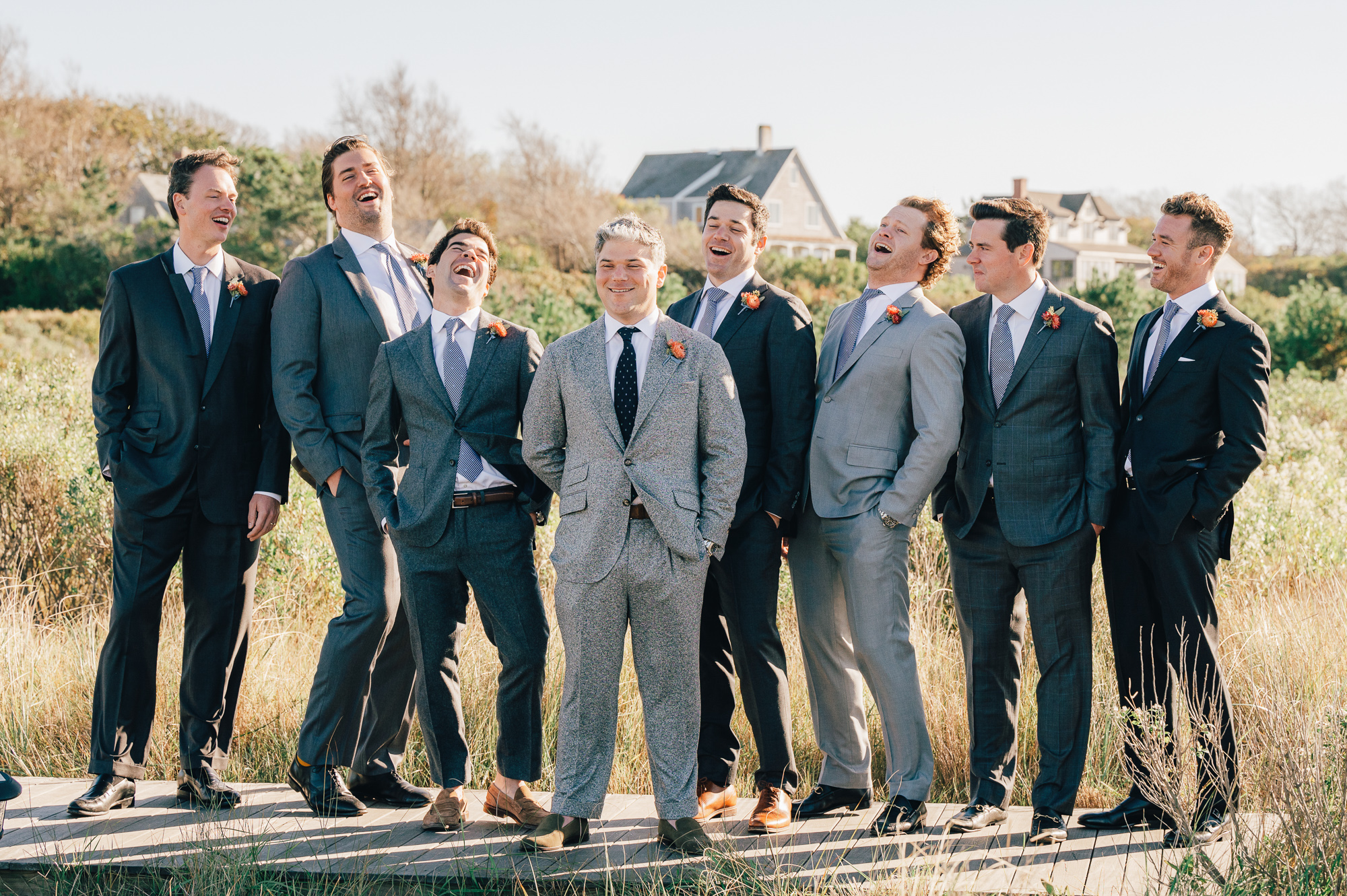 Laura & James were married on the lawn of the Wauwinet, with their vows officiated by author, Marianne Williamson. The perfect fall day on the harbor was GORGEOUSLY accented with the most vibrant autumn colors in the flowers adorning everything from the ceremony arch, the escort card table, the floral and fruit centerpieces, the cake and more. I especially loved how the couple coordinated these colors to enhance James’s grey suit and the bridesmaids’ mix-match blue dresses. A feast for the eyes!