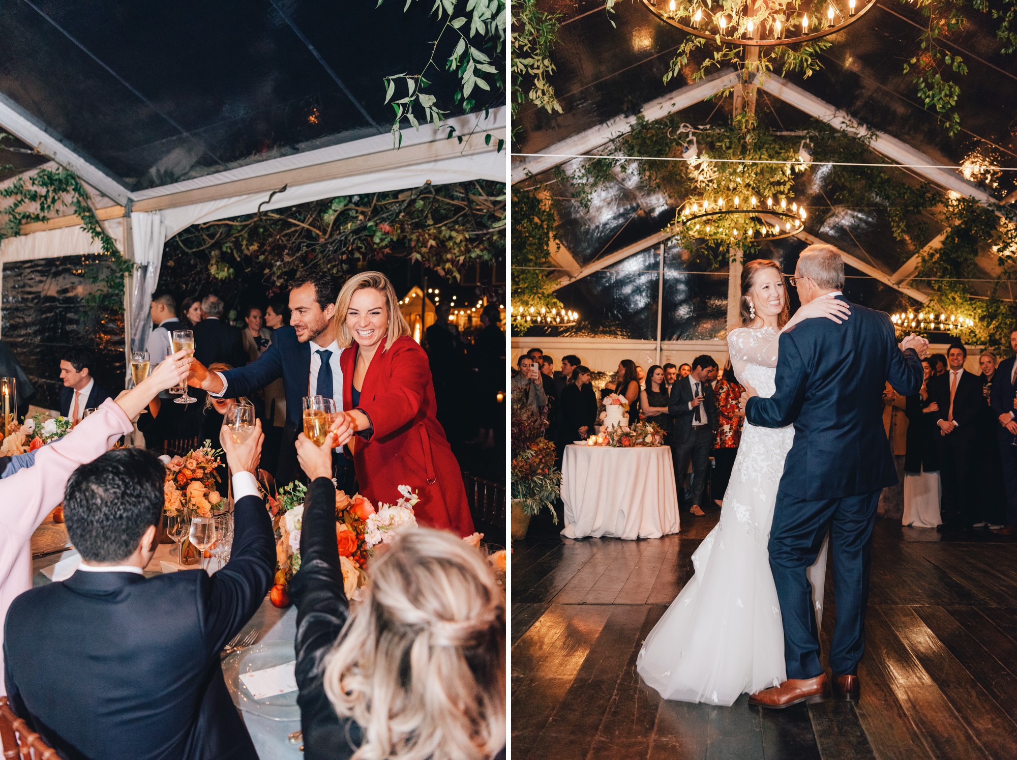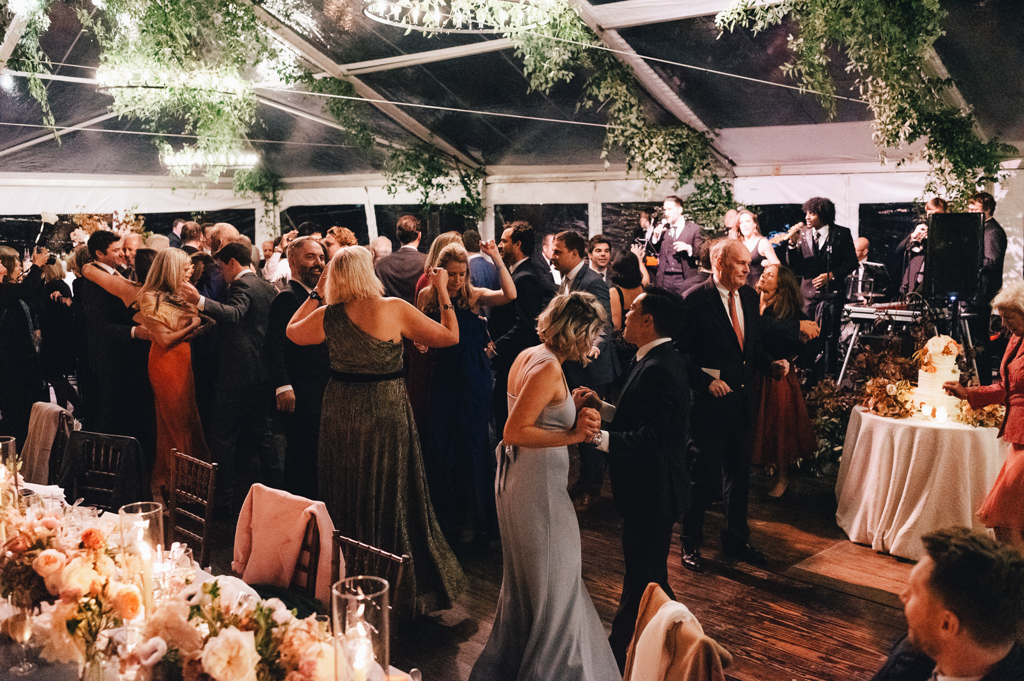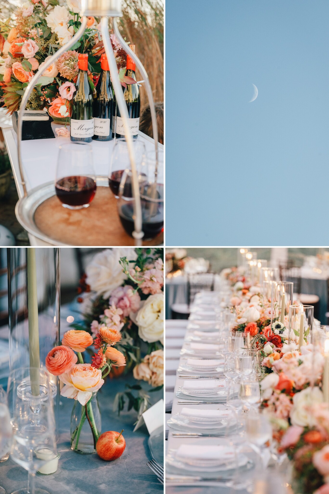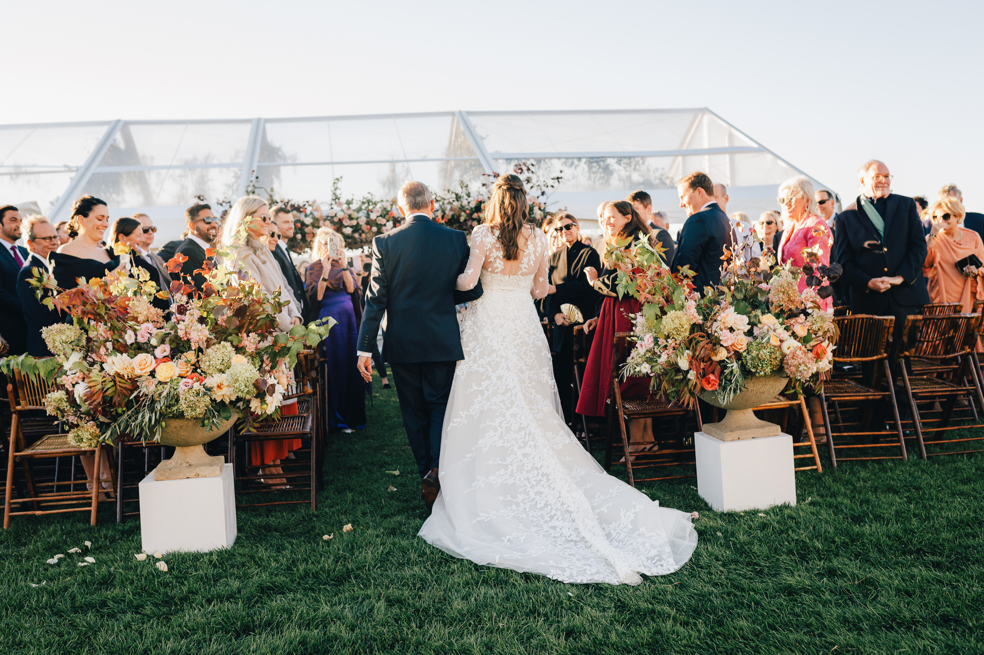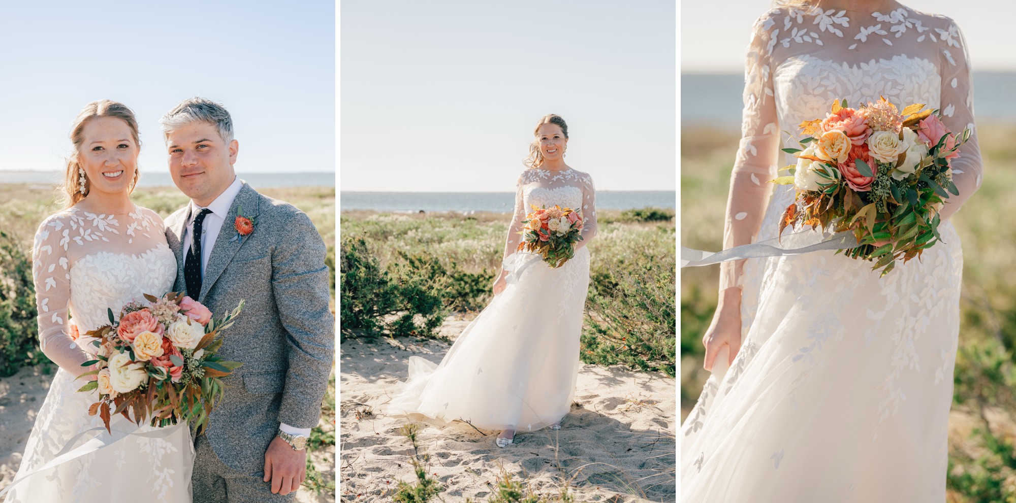 Laura & James were married on the lawn of the Wauwinet, with their vows officiated by author, Marianne Williamson. The perfect fall day on the harbor was GORGEOUSLY accented with the most vibrant autumn colors in the flowers adorning everything from the ceremony arch, the escort card table, the floral and fruit centerpieces, the cake and more. I especially loved how the couple coordinated these colors to enhance James’s grey suit and the bridesmaids’ mix-match blue dresses. A feast for the eyes!